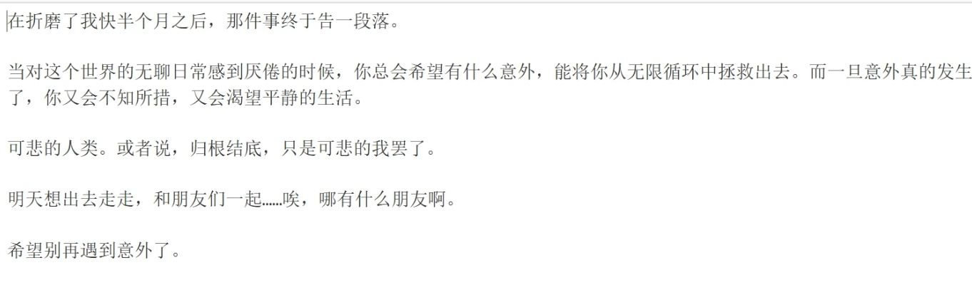 20260326煎熬。 打开日记本,想写点什么。但大脑一片混乱,什么都写不出来。 快点结束吧,求你了。 不管是谁也好。 20260327 在折磨了我快半个月之后,那件事终于告一段落。 当对这个世界的无聊日常感到厌憎的时候,你总会希望有什么意外,能将你从无限循环中拯救出去。而一旦意外真的发生了,你又会不知所措,又会渴望平静的生活。 可悲的人类。或者说,归根结底,只是可悲的我罢了。 明天想出去走走,和朋友们一起……唉,哪有什么朋友啊。看得出来比起之前的只是多了 3月26日的日记(先认定它是日记吧)后半段也就是3月27日的日记是一样的