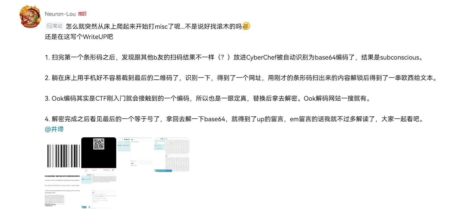 经B友Neuron-Lou确认为ook编码,将欧西给替换为ook,解密后为base64字符,解密后明文为: